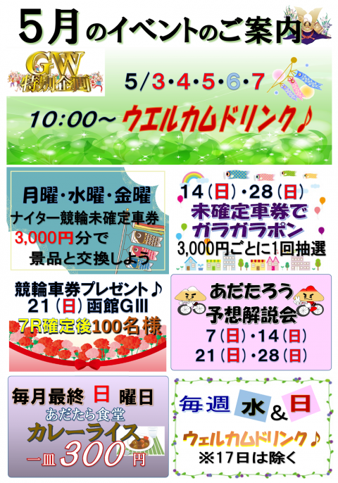| 5月14日(日)・28日(日) | 未確定車券でガラガラポン ※3,000円ごとに1回抽選 |